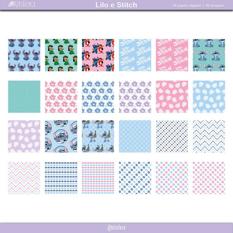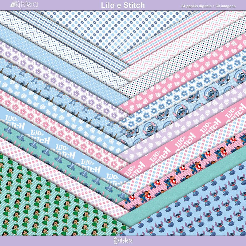 - 24 papéis digitais JPG (12×12 in, 300 DPI) — texturas e estampas inspiradas na Lilo & Stitch.