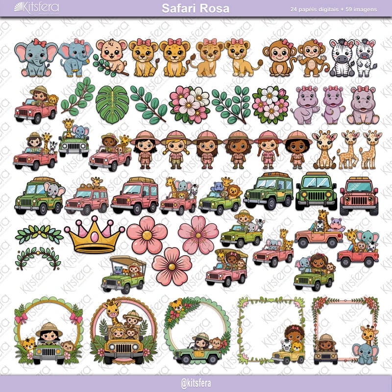 Cada elemento é desenhado com detalhes afetuosos, garantindo que suas criações reflitam a fantasia e a ternura de um Safari Rosa encantado.